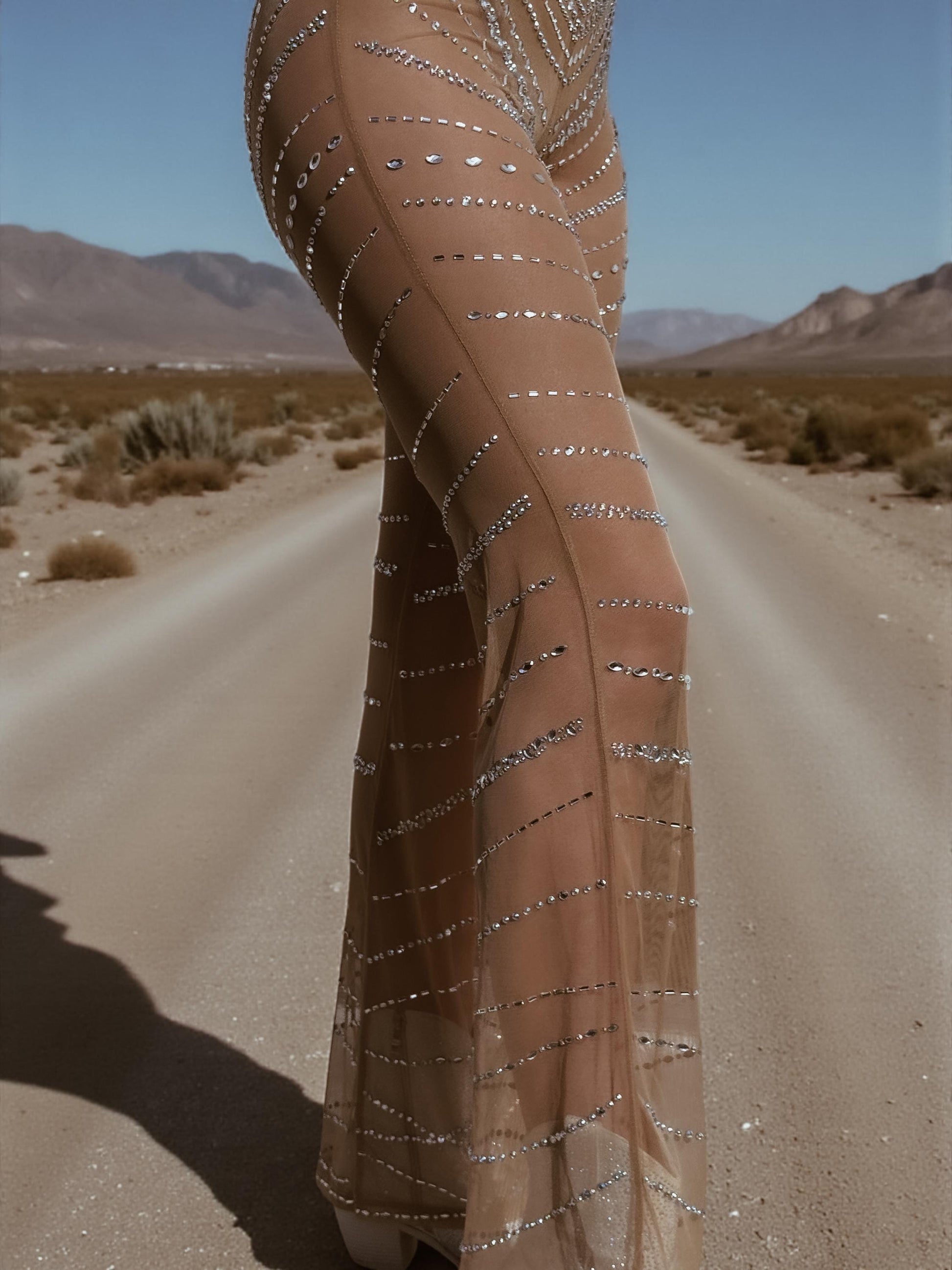 Designed on a sheer nude mesh base fully embellished with rhinestones, this jumpsuit creates a jaw-dropping crystal illusion effect that contours the body like liquid shimmer. The attached bodysuit lining provides coverage while keeping the high-glam see-through sparkle aesthetic.